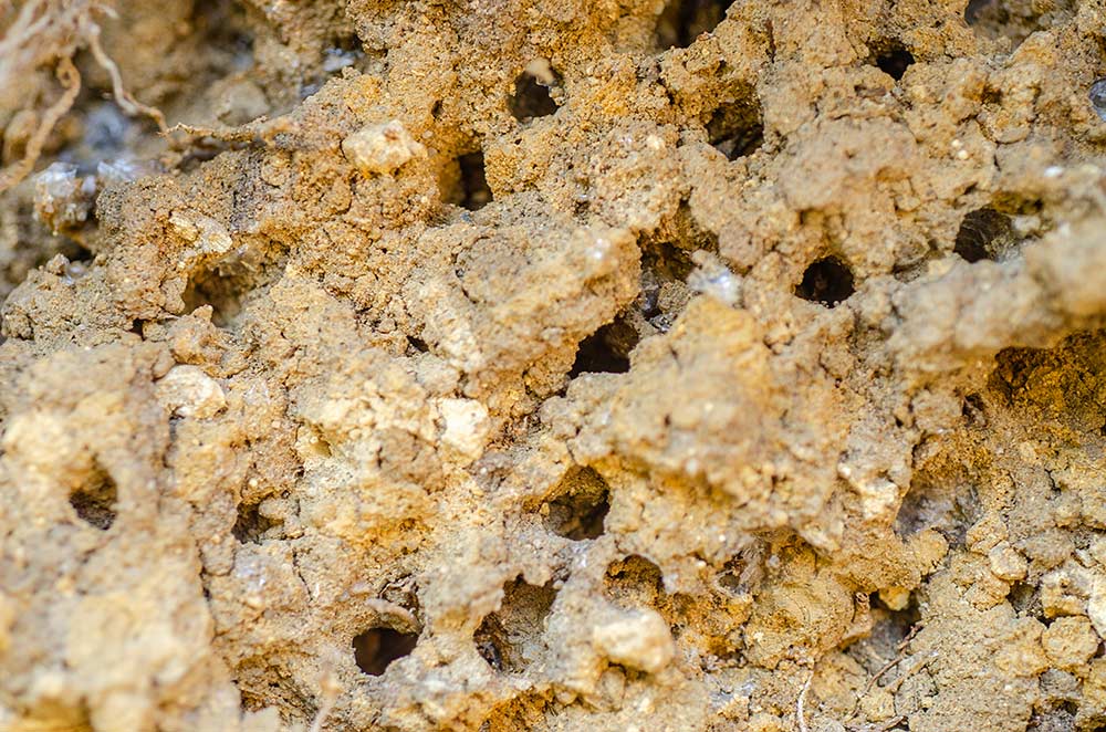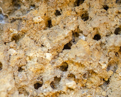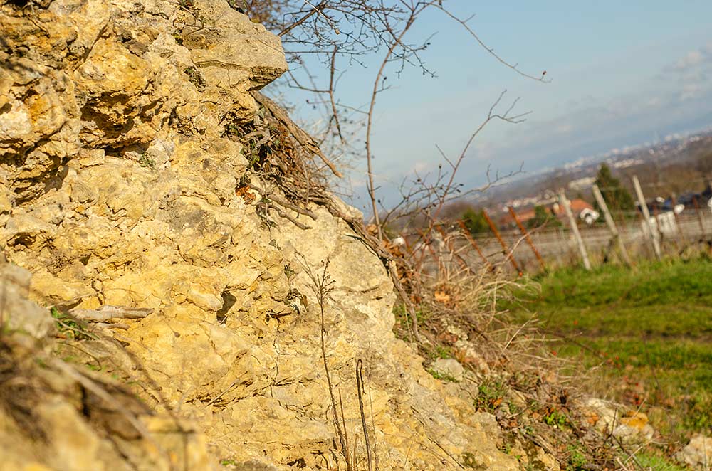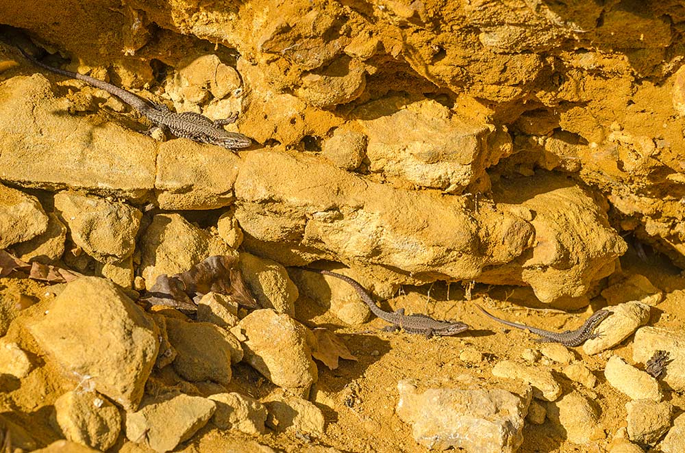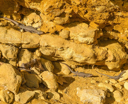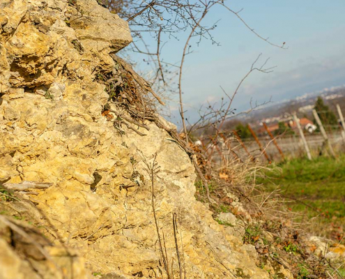 Im Wein kann sich ein von Kalkmergel geprägter Boden durch eine frische Mineralität und aromatische Tiefe auswirken – sofern der Winzer alles richtig macht. Der Königsbacher Idig und der Gimmeldinger Biengarten, zwei unserer Top-Lagen der Pfalz, weisen neben Buntsandstein einen hohen Anteil an diesem Kalkmergel aus dem späten Tertiär auf – das ist das vorletzte von 12 Erdzeitaltern. Nicht umsonst zählen unsere Rieslinge aus beiden Lagen mittlerweile regelmäßig zu den besten der ganzen Pfalz. Spaziergänger und Naturliebhaber kennen die aus Kalkmergel bestehende Böschungskante im Biengarten an der untersten Weinterrasse unterhalb vom König-Ludwig-Pavillon. Eine Info-Tafel und eine Bank laden zum Pausieren und Informieren ein. Eine kleine Bereicherung für alle, die gern mit offenen Augen durchs Leben gehen. Nicht nur wegen des interessanten Einblicks in die Geologie dieser Gegend, sondern weil es gleichzeitig ein Hot Spot für Artenreichtum unter Solitärbienen darstellt. In dem steilen Mosaik aus steinigen, sandigen, lehmigen und tonhaltigen Bereichen legen jedes Jahr Hunderte von Solitärbienen und -wespen (in Deutschland gibt es weit über 500 Arten) ihre Röhren an und reproduzieren sich. Etwas größere Hohlräume werden von Mauereidechsen und natürlich Mäusen als Verstecke genutzt. Ein paar Nischen sind tief genug, um dort frostsicher Winterschlaf zu halten. Laut Literatur werden Eidechsen frühestens Anfang März wieder aktiv. Der 15. Januar, als die Fotos entstanden, war einer von zwei für den Winter außergewöhnlich sonnenwarmen Wintertagen. Einige Eidechsen unterbrachen dafür ihren Winterschlaf und wärmten sich in der Sonne. Die Pfalz macht’s möglich!