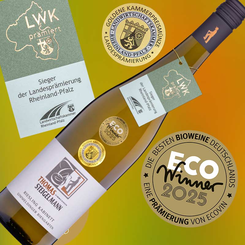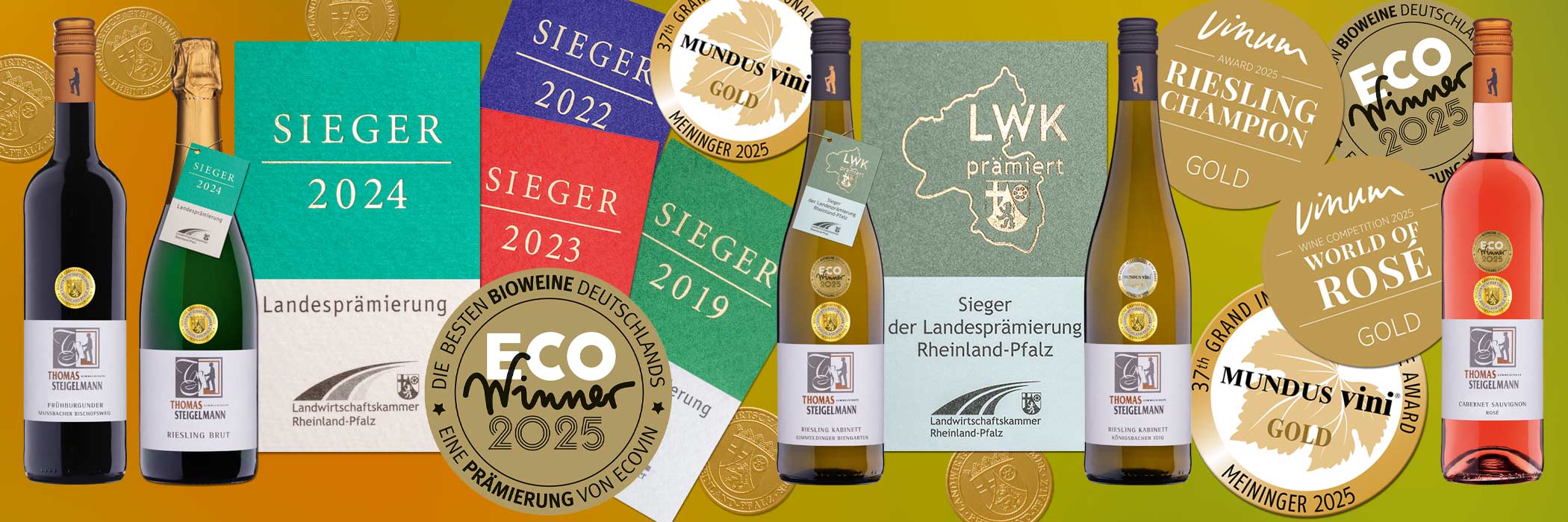 Unser Weingut ist vielfach prämiert. Seit 2010 wurden wir 15 Mal in Folge mit dem Staatsehrenpreis bzw. drei Großen Staatsehrenpreisen (höchste Auszeichnung des Landes) ausgezeichnet. Damit gehören wir zu einem winzigen Anteil von Weingütern der Pfalz mit einer derartigen Kontinuität in der Weinqualität. Wir stellen außerdem mittlerweile fünf Siegerweine und sekte (2019, 2022, 2023, 2024, 2025 – alles Rieslinge) sowie drei weitere Rieslinge auf dem 2. und 3. Platz innerhalb der Landesprämierung für Wein und Sekt!